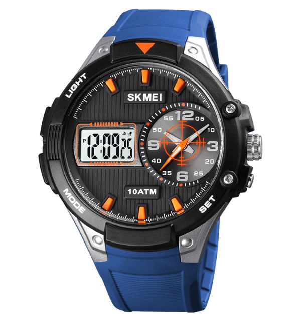 اسکمی، ساعت مچی مردانه، ساعت اسپرت، ساعت چندکاره، کورنومتر، آلارم، روزشمار، نمایش روزهای هفته، نور پشت صفحه، ضد آب، PU، 5ATM، 3 زمانه، ایران اسکمی