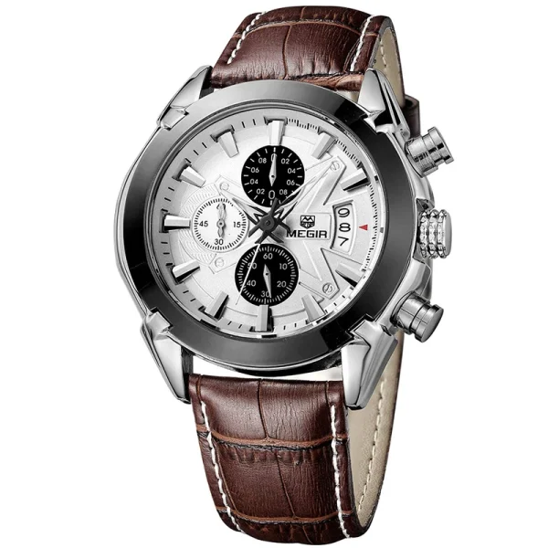 MEGIR 2020 طراحی جذاب و دلنشین خود، نظر هر بینندهای را به خود جلب میکند. این ساعت با قاب استیل ضد زنگ و بند چرم، ظاهری شیک و مدرن دارد.