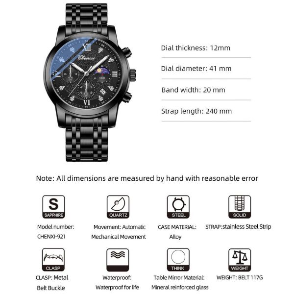 CHENXI 921 یک ساعت مچی مردانه با طراحی جذاب، عملکرد قدرتمند و قیمت مناسب است. این ساعت با ویژگی‌های برجسته خود، به شما امکان می‌دهد تا استایل خود را به بهترین نحو به نمایش بگذارید. اگر به دنبال یک ساعت مچی مردانه با کیفیت و قیمت مناسب هستید، CHENXI 921 انتخابی عالی برای شماست.