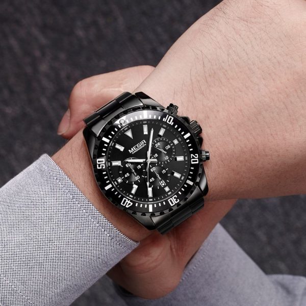 MEGIR 2064 با طراحی جذاب و دلنشین خود، نظر هر بینندهای را به خود جلب میکند. این ساعت با قاب زینک ضد حساسیت و بند استیل، ظاهری شیک و مدرن دارد.