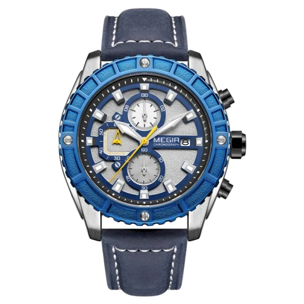 MEGIR 2119 طراحی جذاب و دلنشین خود، نظر هر بینندهای را به خود جلب میکند. این ساعت با قاب استیل ضد زنگ و بند چرم ، ظاهری شیک و مدرن دارد.