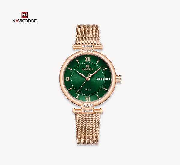 Naviforce 5019 در رنگ های متنوعی مانند رزگلد آبی، رزگلد سفید، سبز و نقره ای عرضه می شود تا با هر سلیقه ای سازگار باشد. شما می توانید رنگ مورد علاقه خود را انتخاب کنید و آن را با لباس های خود ست کنید.