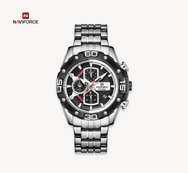 ساعت NAVIFORCE 8018 با سه موتور فعال، زمان را با دقت بالا نشان می دهد. روزشمار، کرنومتر و بند استیل، از دیگر ویژگی های کاربردی این ساعت هستند. قفل استیل، محکم و مقاوم است و از افتادن ساعت جلوگیری می کند.