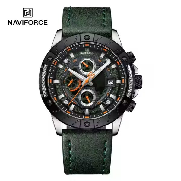 ساعت NAVIFORCE 8055 با طراحی مدرن و جذاب خود، توجه هر بیننده ای را به خود جلب می کند. این ساعت با بند چرمی شیک و صفحه ای با عقربه های شب تاب، ظاهری جذاب و منحصر به فرد دارد.