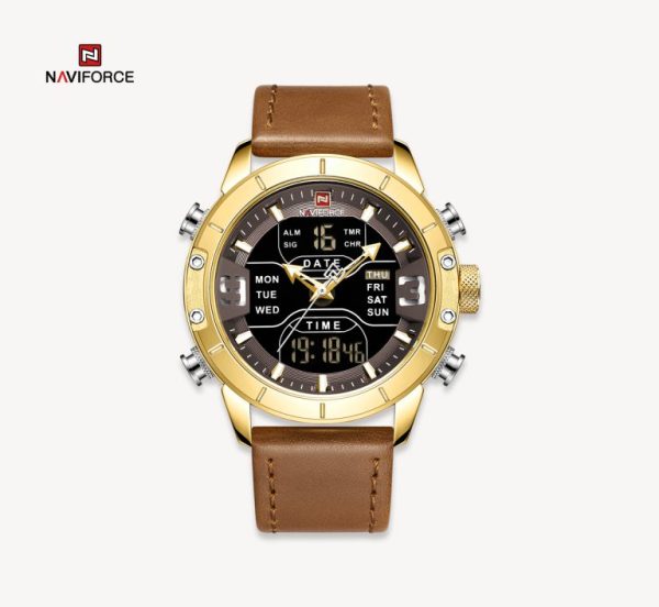 ساعت مردانه Naviforce 9153 با طراحی جذاب و دلنشین خود، توجه هر بیننده ای را به خود جلب می کند. این ساعت با ترکیب رنگ های متنوع و جذاب، از جمله آبی، ابی تیره، چرم طلایی، رزگلد، مشکی، طلایی مشکی، قهوه ای، مشکی مشکی، مشکی و نقره ای، به شما امکان انتخابی متناسب با سلیقه خود را می دهد. بند چرمی این ساعت با کیفیت بالا و دوام بالا، راحتی و زیبایی را به شما هدیه می دهد.