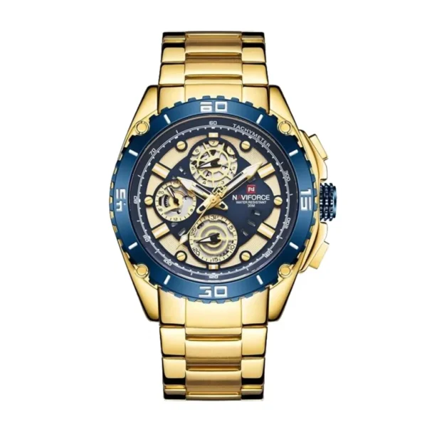 ساعت مردانه Naviforce 9179 با طراحی جذاب و دلنشین خود، نظر هر بیننده ای را به خود جلب می کند. این ساعت با ترکیب رنگ های متنوع و بند استیل، ظاهری شیک و مدرن به شما می بخشد. شما می توانید این ساعت را در رنگ های طلایی آبی، مشکی مشکی و مشکی نقره ای انتخاب کنید تا با سلیقه و استایل خود هماهنگ باشد.