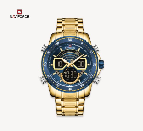 ساعت Naviforce 9189 با طراحی مدرن و جذاب، چشم هر بیننده ای را به خود جلب می کند. این ساعت با ترکیب رنگ های متنوعی مانند آبی، ترکیبی آبی، طلایی آبی و نقره ای، به شما امکان انتخابی متناسب با سلیقه خود را می دهد. صفحه ساعت با قطر 45.5 میلی متر، فضایی مناسب برای نمایش اطلاعات مختلف مانند زمان، تاریخ، روز هفته و کرنومتر را فراهم می کند. عقربه های شب تاب، خوانایی ساعت را در تاریکی نیز تضمین می کنند.