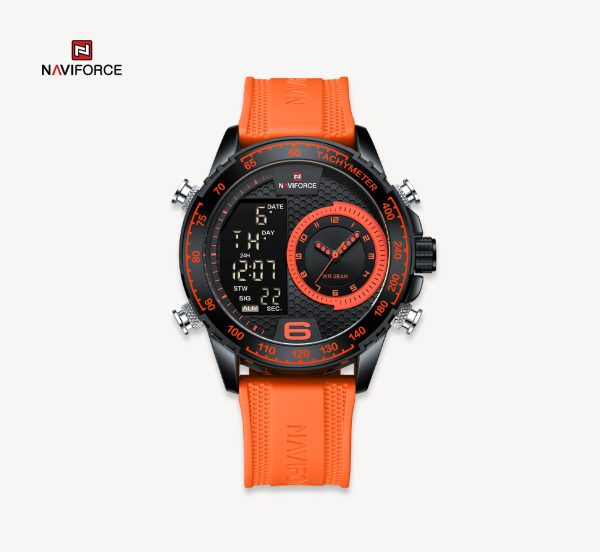 ساعت مردانه Naviforce 9199 با طراحی جذاب و دلنشین خود، توجه هر بیننده ای را به خود جلب می کند. این ساعت در رنگ های متنوعی مانند آبی، زرد، طلایی، قرمز، قهوه ای، مشکی، نقره ای و نارنچی عرضه می شود تا با سلیقه هر فردی مطابقت داشته باشد. بند سیلیکون نرم و راحت این ساعت، احساس راحتی و آرامش را به شما القا می کند و به شما اجازه می دهد تا ساعت ها آن را بدون هیچ گونه ناراحتی بر روی دست خود داشته باشید.