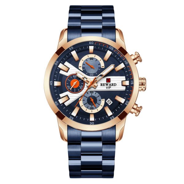 ساعت مچی مردانه Reward 81014 علاوه بر زیبایی ظاهری، امکانات کاربردی بسیاری را در اختیار شما قرار میدهد. این ساعت دارای سه موتور فعال کورنوگراف است که به شما امکان میدهد زمان را با دقت بالا اندازه گیری کنید. عقربههای شب تاب این ساعت، خواندن زمان را در تاریکی آسان میکند. شیشه کریستالی مقاوم در برابر ضربه و خش این ساعت، از صفحه ساعت در برابر آسیب محافظت میکند. جنس بدنه آلیاژ روی Zinc ضد حساسیت این ساعت، آن را برای افرادی که پوست حساسی دارند، مناسب میکند. این ساعت همچنین دارای تقویم و کرنومتر است که به شما امکان میدهد زمان را به طور دقیق مدیریت کنید.