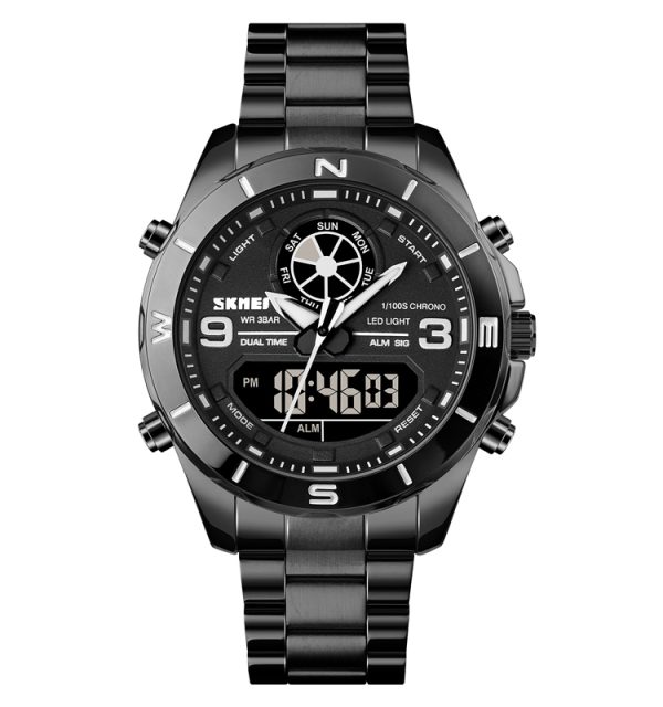 بند استیل: بند استیل این ساعت، علاوه بر زیبایی، مقاومت بالایی در برابر سایش و زنگ زدگی دارد.
