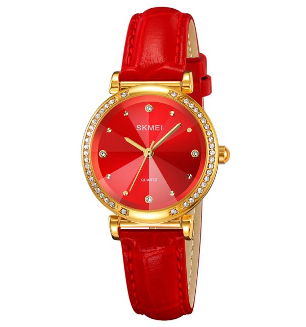 ساعت مچی زنانه اسکمی مدل 2072 در رنگهای متنوعی مانند سبز، طلایی و قرمز عرضه میشود تا با هر سلیقهای هماهنگ باشد.