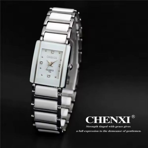 ساعت مچی زنانه چنکسی مدل CHENXI 104 با طراحی شیک و مدرن خود، به هر استایلی جلوه ای خاص می بخشد. این ساعت با بند ترکیبی از جنس استیل و پلاستیک و صفحه مستطیل خود، ظاهری کلاسیک و در عین حال مدرن دارد.